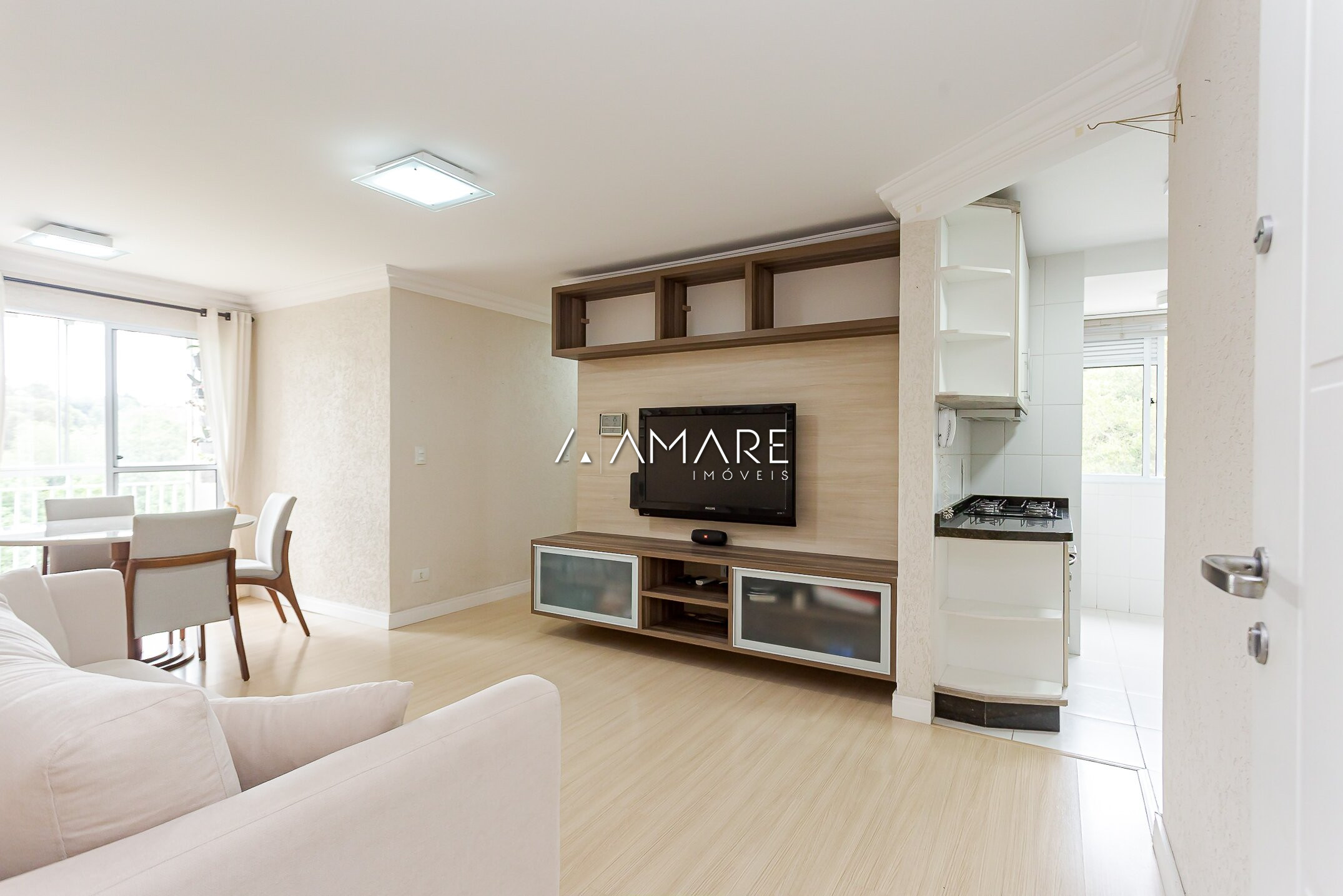 A sala de estar integrada à cozinha proporciona um ambiente moderno e aconchegante, perfeito para reunir amigos ou família.